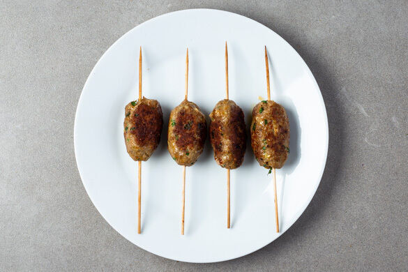 Die Kebabs in einer zweiten Pfanne mit 1EL Olivenöl bei mittlerer Hitze 4–5Min. rundum braten, bis das Fleisch durch ist. Die Kebabs auf einem Teller beiseitestellen, die Pfanne auswischen.