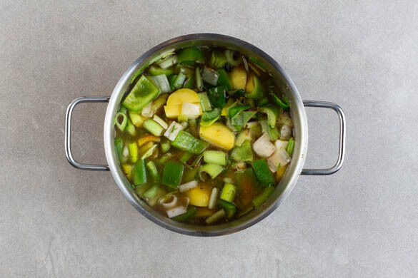 Den Lauch, die groben Paprikastücke und die geschälten Kartoffeln in einem mittelgroßen Topf mit 1EL Olivenöl bei mittlerer Hitze ca. 3Min. anbraten. Die Gewürzmischung und die Korianderstängel hinzugeben und ca. 2Min. mitbraten. 400ml Wasser angießen, dann die ½ des Brühgewürzes einrühren. Das Gemüse abgedeckt in 13–15Min. weich köcheln.