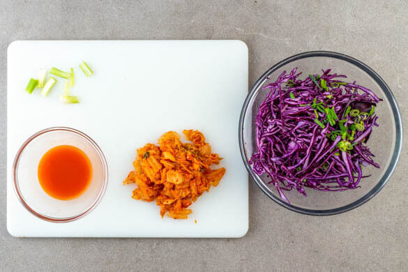 400g Rotkohl und den grünen Teil der Lauchzwiebeln in feine Streifen schneiden, in eine Schüssel geben und beiseitestellen. Den weißen Teil der Lauchzwiebeln längs halbieren und quer in ca. 2cm große Stücke schneiden. Das Kimchi abgießen und grob schneiden, den Saft aufbewahren.