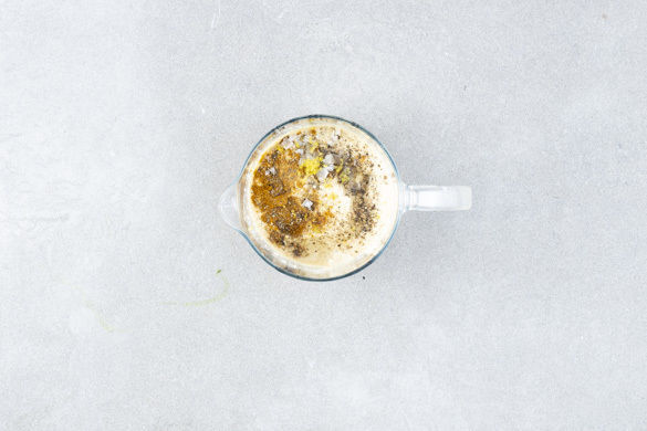 Die Kichererbsen in einem hohen Gefäß mit 6EL Kichererbsenwasser, der Tahinipaste und 1EL Olivenöl mit einem Stabmixer pürieren. Das Hummus mit der ½ des Zitronensafts, 1TL Zitronenschale, 1TL Gewürzmischung sowie Salz und Pfeffer abschmecken.