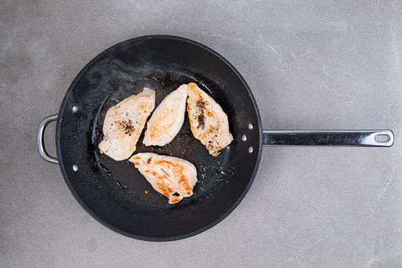 Das Fleisch in einer mittelgroßen Pfanne bei starker Hitze auf jeder Seite ca. 2Min. scharf anbraten, dann aus der Pfanne nehmen und auf einem Teller beiseitestellen. Die Temperatur auf die niedrigste Stufe reduzieren.