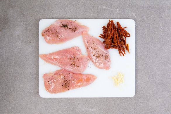 Das Fleisch trocken tupfen und so halbieren, dass je 2 dünne Schnitzel entstehen. Ggf. das Fleisch zwischen Klarsichtfolie legen und mit einem Fleischklopfer oder einer schweren Pfanne ca. 1cm dünn plattieren. Das Fleisch mit 1EL Olivenöl einreiben und mit Salz und Pfeffer würzen. Den Knoblauch schälen und fein würfeln. Die getrockneten Tomaten in dünne Streifen schneiden.