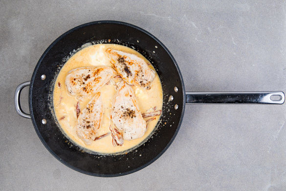 Ca. 250ml Wasser in die heiße Pfanne geben und das Brühgewürz dazugeben. Die getrockneten Tomaten, den Knoblauch und die Crème fraîche unterrühren und mit Salz und Pfeffer abschmecken. Das Fleisch samt ausgetretenem Saft in die Sauce legen und alles 7–8Min. sanft köcheln lassen.