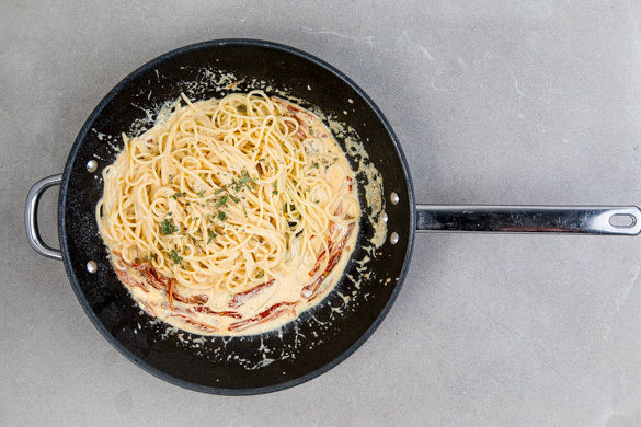 Ca. 500ml Wasser in die heiße Pfanne geben und das Brühgewürz dazugeben. Die getrockneten Tomaten, den Knoblauch und die Crème fraîche unterrühren und mit Salz und Pfeffer abschmecken. Das Fleisch samt ausgetretenem Saft in die Sauce legen und alles 7–8Min. sanft köcheln lassen.