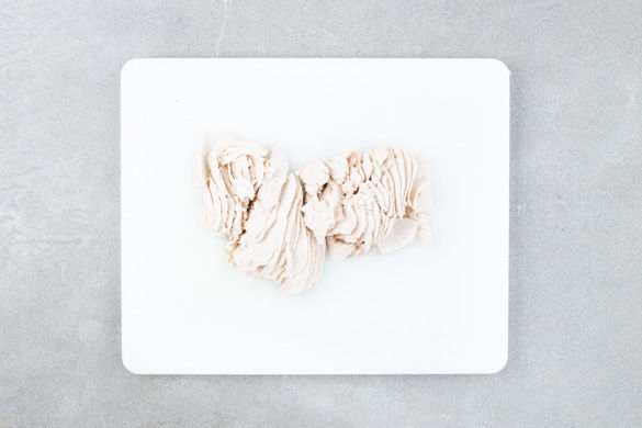 Das Fleisch in einem Sieb abtropfen lassen und anschließend entweder in hauchdünne Scheibchen schneiden oder mit 2 Gabeln in dünne Streifen zupfen.