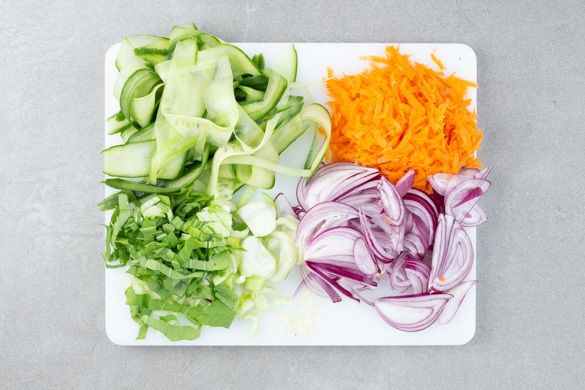 Die Gurke mit einem Sparschäler rundum bis zum Kerngehäuse in breite Streifen schneiden. Den Pak Choi längs halbieren und in 1–2cm breite Streifen schneiden. Die Karotte schälen und mit einer Küchenreibe grob raspeln. Die Zwiebel schälen, halbieren und in hauchdünne Streifen schneiden. Den Knoblauch schälen und fein reiben.