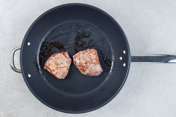 Das Fleisch mit etwas Küchenkrepp trocken tupfen, in 2 gleich große Medaillons schneiden und mit Salz und Pfeffer würzen. In einer mittelgroßen Pfanne mit 1EL Olivenöl bei starker Hitze auf jeder Seite ca. 2Min. scharf anbraten. Auf einem Teller beiseitestellen.