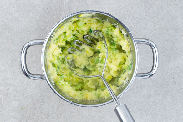 Den Lauch für die restlichen 1–2Min. zu den Kartoffeln geben und mitkochen. Das Gemüse abgießen, dabei etwas Kochwasser auffangen, und anschließend unter Zugabe von Kochwasser cremig stampfen. Mit Salz und Pfeffer würzen. Die Medaillons mit dem Stampf, den Tomaten, der Sauce und der Nussbutter anrichten und servieren.