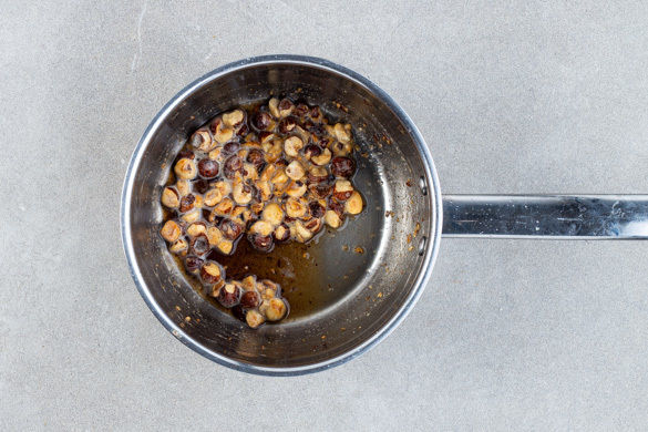 Die Haselnüsse grob hacken und mit 2EL Butter in einem kleinen Topf bei mittlerer Hitze leicht braun werden lassen. Den Topf vom Herd nehmen.
