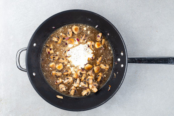 Die Champignons in der Pfanne mit 1EL Pflanzenöl bei mittlerer bis starker Hitze ca. 5Min. scharf anbraten. Die Zwiebeln dazugeben und bei mittlerer Hitze 1–2Min. mitbraten. Alles mit 1EL Mehl bestäuben und verrühren. Die Crème fraîche und den Steinpilzsud unterrühren und ca. 5Min. sanft einkochen lassen, bis eine cremige Sauce entsteht.