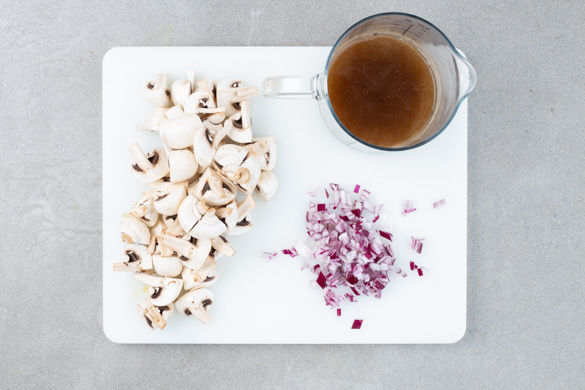 In einem mittelgroßen Topf ausreichend leicht gesalzenes Wasser für die Spätzle zum Kochen bringen. 2/3 des Steinpilzpulvers in 200ml heißen Wasser auflösen. Die Champignons ggf. mit einer Bürste oder etwas Küchenkrepp säubern und je nach Größe vierteln oder achteln. Die Zwiebel schälen, halbieren und fein würfeln.