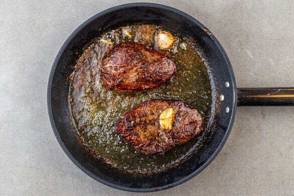 Die Pfanne vom Herd nehmen und die Hitze auf die niedrigste Stufe reduzieren. 2EL kalte Butter und den Knoblauch in die Pfanne geben und die Pfanne zurück auf den Herd stellen. Das Fleisch auf jeder Seite weitere 1–2Min. braten, dabei mit einem Löffel kontinuierlich Bratfett über das Fleisch. Das Fleisch bis zum Servieren abgedeckt auf einem Teller ruhen lassen.