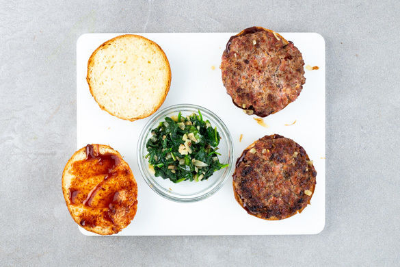 Die Burgerbrötchen mit der BBQ-Sauce bestreichen und mit dem Spinat und den Pattys belegen. Die Pastinakenpommes nach Belieben mit dem Paprikapulver verfeinern und mit der Sriracha-Mayonnaise zu den Burgern servieren.