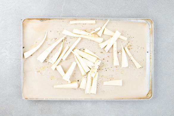 Die Pastinaken schälen, längs vierteln und quer halbieren. Den oberen, dickeren Teil der Pastinaken noch einmal längs halbieren, sodass etwa gleich große pommesartige Stifte entstehen. Die Pastinakenpommes auf einem mit Backpapier ausgelegten Backblech mit 1–2EL Olivenöl sowie Salz und Pfeffer vermengen, gleichmäßig verteilen und 15–20Min. im Ofen rösten.