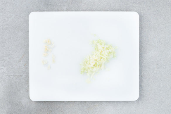 Den Backofen auf 200°C Umluft (220°C Ober-/Unterhitze) vorheizen. Die Zwiebeln schälen, halbieren und in feine Würfel schneiden. Den Knoblauch schälen und in hauchdünne Scheibchen schneiden.