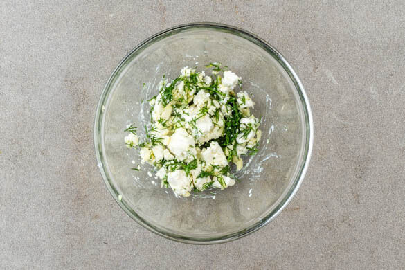 Den Dill grob schneiden. Den Knoblauch schälen und durch eine Knoblauchpresse drücken oder sehr fein würfeln. 2TL Zitronensaft mit der ½ des Dills, dem Knoblauch und 1½EL Olivenöl verrühren, den Feta zerbröseln und untermengen. Bis zum Servieren ziehen lassen.