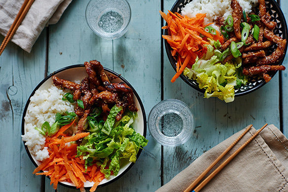 Zartes Schweinegeschnetzeltes wird mit einer würzig-süßen Mischung aus Sojasauce und Honig gebraten und mit einem frischen Salat und knackigen Karotten auf Sushireis serviert. Wer mag, kann am Tisch alles typisch koreanisch miteinander vermengen – so verbinden sich die Aromen am besten! Lasst es euch schmecken!