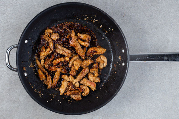 Das Fleisch aus der Marinadenflüssigkeit nehmen und in einer großen Pfanne mit 1–2EL Pflanzenöl bei starker Hitze 2–3Min. von allen Seiten anbraten. Die Marinadenflüssigkeit hinzufügen und 2–3Min. unterrühren, bis das Fleisch von einer sirupartigen Sauce überzogen ist. Den Sesam unterrühren.