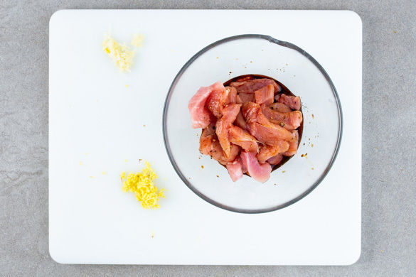 In einem mittelgroßen Topf 600ml Wasser für den Reis zum Kochen bringen. Den Ingwer schälen und fein reiben. Den Knoblauch schälen und ebenfalls fein reiben. Das Fleisch trocken tupfen und mit dem Ingwer, dem Knoblauch, dem Reisessig, der Sojasauce, 2EL Honig oder 1EL Zucker sowie 1 Prise Pfeffer vermengen und beiseitestellen.