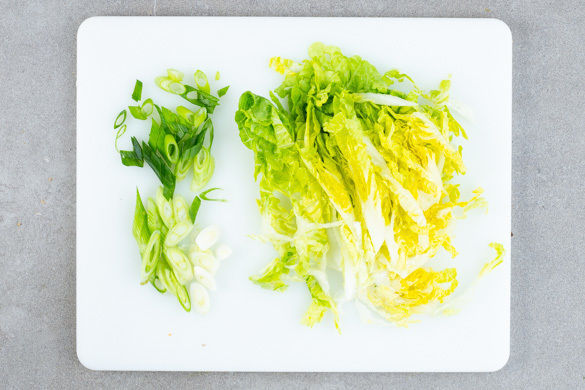 Den Romanasalat in feine Streifen schneiden, dabei den harten Strunk entfernen. Die Lauchzwiebeln schräg in feine Ringe schneiden.