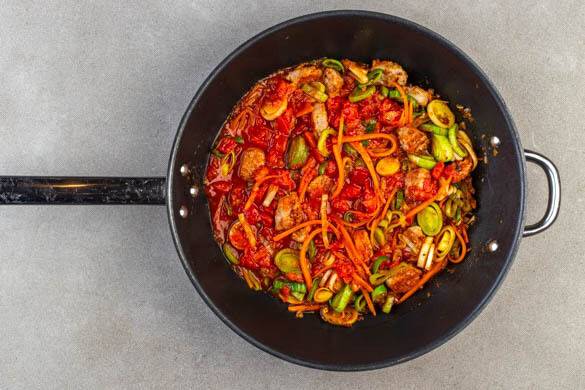 Den Gemüsemix zur Wurst in die Pfanne geben und 3–4Min. mitbraten, dann mit der Gewürzmischung nach Geschmack würzen.