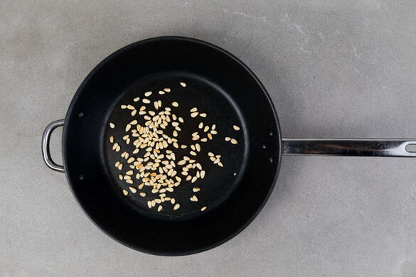 Die Pinienkerne in einer kleinen Pfanne bei mittlerer Hitze ohne Zugabe von Fett 1–2Min. goldbraun anrösten. Zum Abkühlen auf einem Teller beiseitestellen.