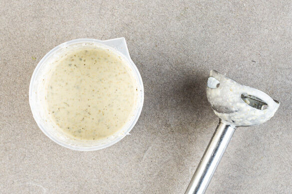Den Knoblauch schälen. Den Käse grob reiben, dann mit dem Knoblauch, der ½ der Kapern, 2EL Mayonnaise und 1EL Essig in einem hohen Gefäß mit einem Stabmixer zu einem cremigen Dressing pürieren. Ggf. etwas Wasser hinzufügen, falls das Dressing zu dickflüssig ist. Mit Salz und Pfeffer abschmecken.