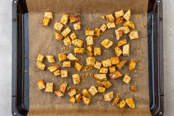 Den Backofen auf 200°C (180°C Umluft) vorheizen. 2 Knoblauchzehen schälen und durch eine Knoblauchpresse drücken oder sehr fein würfeln, dann mit 4EL Olivenöl und je 1 Prise Salz und Pfeffer verrühren. Die Brötchen in ca. 1cm große Würfel schneiden, in einer Auflaufform mit dem Knoblauchöl vermengen und im Ofen in 8–10Min. goldbraun und knusprig backen.