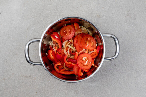 In einem mittelgroßen Topf 600ml leicht gesalzenes Wasser für den Reis zum Kochen bringen. Die Paprika vierteln, entkernen und in Streifen schneiden. Die Tomaten in dünne Scheiben schneiden. Die Zwiebel schälen, halbieren und in dünne Streifen schneiden. Den Knoblauch schälen und fein würfeln.