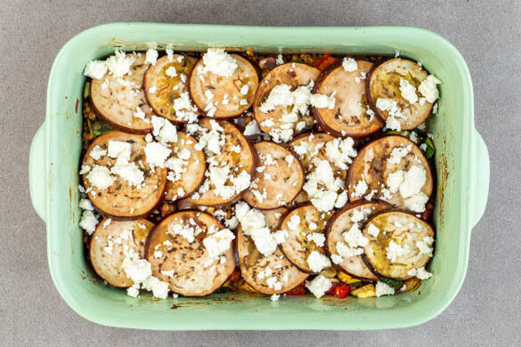 Den Greek White mit den Fingern oder einer Gabel zerkrümeln. Die Alufolie nach ca. 15Min. entfernen, den Greek White über den Auflauf streuen und nochmals ca. 15Min. oder bis zur gewünschten Bräunung backen. Den Auflauf auf Teller verteilen und servieren.