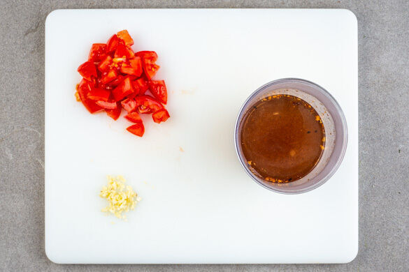 Den Knoblauch schälen und fein würfeln. Die ½ der Tomaten in ca. 1cm große Würfel schneiden. 600ml Wasser in einem Wasserkocher aufkochen, dann das Brühgewürz und die Chiliflocken in dem heißen Wasser auflösen.