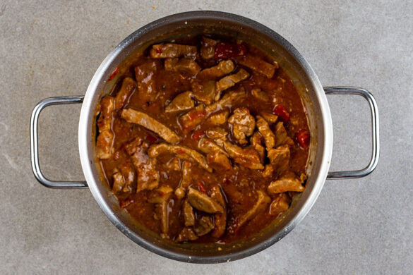 Den Backofen auf 240°C (220°C Umluft) vorheizen. Wenn das Fleisch ca. 15Min. geköchelt hat, die Süßkartoffeln samt Schale in 3–5mm dünne Scheiben schneiden, auf einem mit Backpapier ausgelegten Backblech mit 2EL Pflanzenöl, ½TL Salz und 1 kräftigen Prise Pfeffer vermengen und gleichmäßig verteilen. Im Ofen in ca. 20Min. goldbraun backen, dabei einmal wenden.