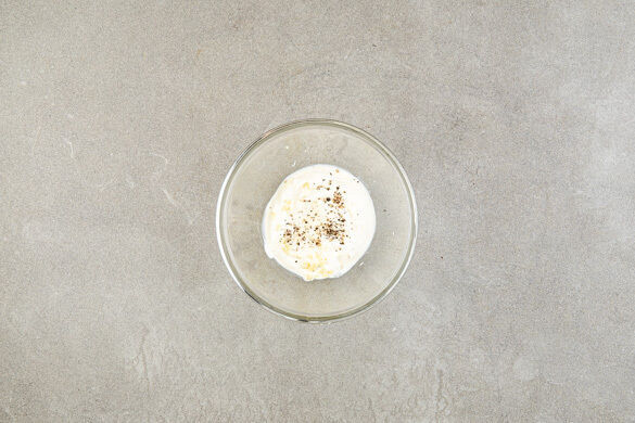 Den Knoblauch schälen und sehr fein würfeln oder durch eine Knoblauchpresse drücken. Den Violife Creamy mit dem Knoblauch sowie je 1 Prise Salz und Pfeffer verrühren.