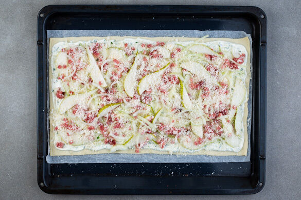 Den Teig mit den Birnen, den Zwiebeln und dem Speck belegen, dann den Käse darüberreiben. Den Flammkuchen ca. 15Min. im Ofen backen, bis der Teig goldbraun und knusprig ist.
