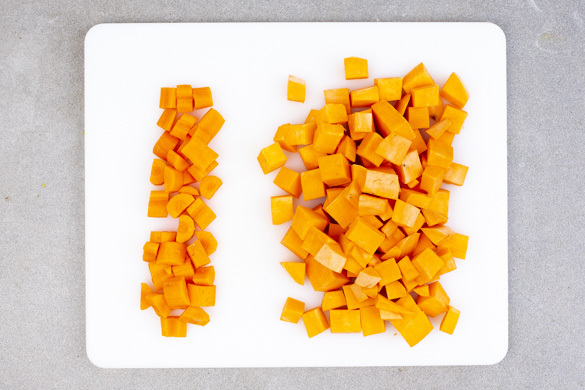 Die Karotten ggf. schälen und in kleine Würfel schneiden. Die Süßkartoffel schälen und in ca. 1cm große Würfel schneiden.
