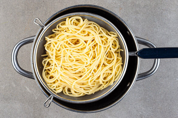Die Pasta in das kochende Wasser geben und in 8–10Min. bissfest kochen. Mit einer Tasse etwas Pastawasser abschöpfen, dann die Pasta in ein Sieb abgießen und abtropfen lassen, dann zurück in den Topf geben und warm halten.