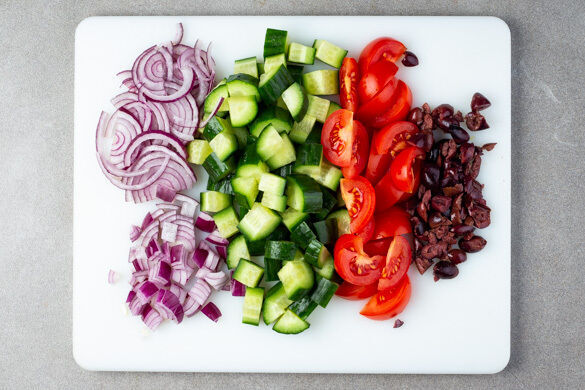 Die Zwiebel schälen und halbieren, eine Hälfte in dünne Streifen schneiden, die andere Hälfte grob würfeln. Die Gurke längs vierteln und in ca. 1cm große Würfel schneiden. Die Tomaten in schmale Spalten schneiden. Die Oliven grob schneiden.
