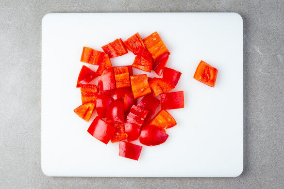 Die Paprika vierteln, entkernen und in 1–2cm große Würfel schneiden.