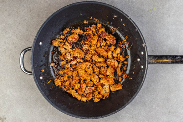 Das Hackfleisch in einer mittelgroßen Pfanne mit 1EL Pflanzenöl bei starker Hitze 3–5Min. krümelig anbraten. In der Zwischenzeit den Knoblauch schälen und durch eine Knoblauchpresse drücken oder sehr fein würfeln. In der letzten Minute den Knoblauch und je 1 kräftige Prise Salz und Pfeffer unterrühren, dann mit der restlichen Sojasauce ablöschen und vom Herd nehmen.