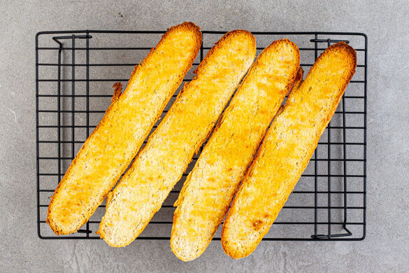 Die Brötchen längs aufschneiden und die Innenseiten mit insgesamt 2EL Olivenöl bestreichen. Die Brötchenhälften 5–7Min. im Ofen aufbacken.