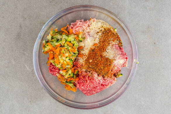 Das Hackfleisch, die ½ der Zwiebeln, die ½ des Knoblauchs, 1 Ei, die Semmelbrösel, die ½ der Gewürzmischung und je ½TL Salz und Pfeffer in eine Schüssel geben. Die Gemüseraspel in einem sauberen Küchentuch möglichst gut auspressen, dann die ½ der Gemüseraspel ebenfalls in die Schüssel geben.