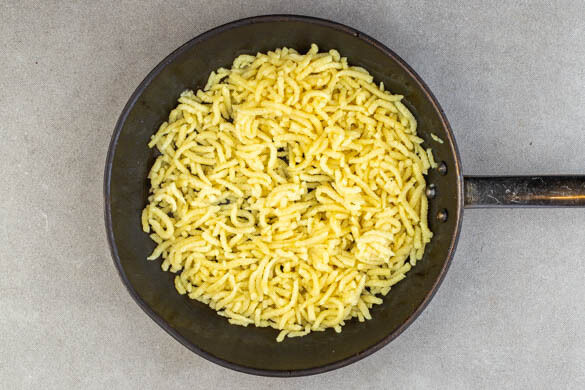 Den Käse und 100–150ml Wasser zu den Spätzle in die Pfanne geben und bei mittlerer bis starker Hitze rühren, bis die Spätzle gleichmäßig mit Käsesauce bedeckt sind. Nach Geschmack mit dem Trüffelöl und je 1 Prise Salz und Pfeffer würzen.