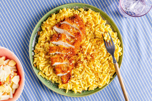 Schnitzel und Spätzle – wir könnten uns kaum eine bessere Kombination ausmalen! Heute wird es extralecker, denn zu den saftigen Schnitzeln Hähnchen-Art gesellen sich feine Käsespätzle, die dank Trüffelöl eine besonders aromatische Note erhalten. Ein knackiger Apfel-Kohlrabi-Salat ist der erfrischend-fruchtige Begleiter. Na dann, ran an die Gabel!