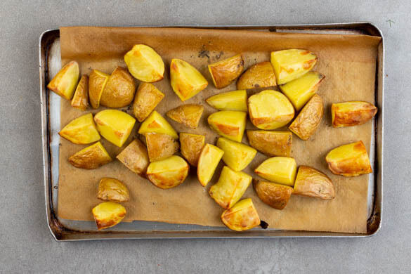 Den Backofen auf 240°C (220°C Umluft) vorheizen. Die Kartoffeln samt Schale vierteln, mit 2EL Olivenöl und ½TL Salz vermengen und auf einem mit Backpapier ausgelegten Backblech verteilen. Im Ofen auf der mittleren Schiene 25–28Min. rösten, bis die Kartoffeln goldbraun sind.