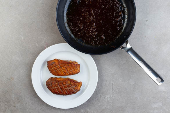 Das Fleisch wenden und weitere ca. 3Min. braten, dann auf einem Teller abgedeckt warm halten. Das Entenfett in ein Glas füllen und für ein anderes Rezept aufbewahren. Die Pfanne mittelhoch erhitzen, den übrigen Orangensaft, 2TL Orangenschale, 2TL Sojasauce, 2EL Honig und die Gewürzmischung einrühren und bei mittlerer bis niedriger Hitze ca. 3Min. einköcheln lassen.