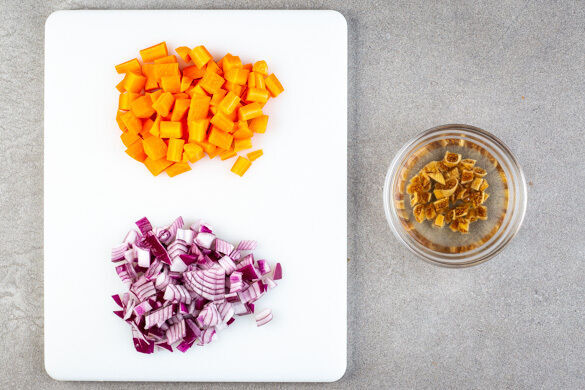 In einem mittelgroßen Topf ausreichend gesalzenes Wasser für die Pasta zum Kochen bringen. Die Datteln in 100ml heißem Wasser einweichen. Die Karotte ggf. schälen, längs vierteln und in 1–2cm große Würfel schneiden. Die Zwiebel schälen, halbieren und grob würfeln.