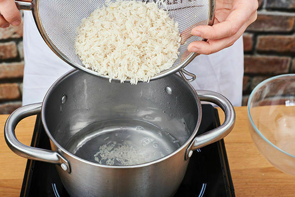 In einem mittelgroßen Topf 600ml leicht gesalzenes Wasser zum Kochen bringen. Den Reis in einem Sieb kalt abspülen, bis das Wasser klar bleibt. Sobald das Wasser kocht, den Reis hineingeben und abgedeckt bei niedrigster Hitze 8–10Min. kochen, bis das Wasser aufgesogen und der Reis gar ist. Noch ca. 5Min. ohne Hitzezufuhr ziehen lassen.