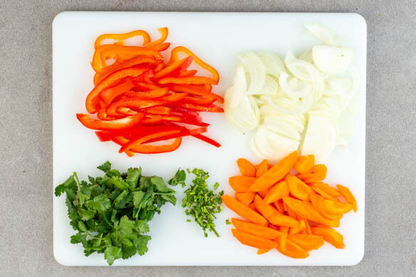 Die Zwiebel schälen, halbieren und in feine Streifen schneiden. Die Karotte ggf. schälen, längs halbieren und schräg in dünne Scheiben schneiden. Die Paprika vierteln, entkernen und in dünne Streifen schneiden. Die Korianderblätter von den Stängeln streifen und für die Garnitur beiseitelegen. Die Korianderstängel fein hacken.