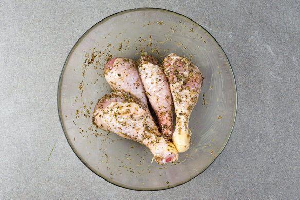 Den Backofen auf 220°C (200°C Umluft) vorheizen. Die Zitrone halbieren und auspressen. Die Drumsticks mit 2EL Zitronensaft, 2EL Olivenöl, der ½ des Oregano, 2 Prisen Salz und 1 Prise Pfeffer vermengen und beiseitestellen.