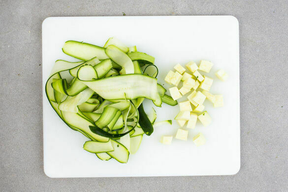 Die Zucchini mit einem Sparschäler oder einem Gemüsehobel rundum in breite Streifen schneiden. Das Kerngehäuse in kleine Würfel schneiden.